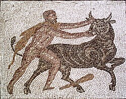 Miken shohi Evrisfey Geraklga Krit buqasini Mikenaga olib kelishni buyurdi. Qahramon Minosning roziligi bilan hayvonni ushlab, yelkasiga mindi va Kritdan Peloponnesga ajoyib buqada dengizni kesib oʻtib Evrisfeyga yetkazdi. Bu jasoratni amalga oshirib, Gerakl Alfea vodiysida Olimpiya oʻyinlarini tashkil qildi. Boʻshatib yuborilgan hayvon quturgandan keyin butun Peloponnes boʻylab yugurib, Attikagacha yetib bordi.
