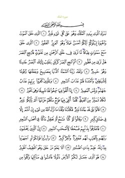 Qurʼon nusxalaridan biridagi Mulk surasi sarlavhasi. Yuqorida oʻngdan: 1. Oyati 30, 2. Markazda qizil rangda sura tartib raqami 67, qora rangda - Mulk surasi va Makkiy, qizil rangda nozil boʻlgan tartibi - 77, 3. Rukuʼsi soni - 2; Pastda oʻngdan: 1. Sura:Makkiy, 2. Tilovat tartibi:67, 3. Nozil boʻlish tartibi:77, 4. Rukuʼsi:2, 5. Oyati:30, 6. Porasi (Juzi):29 deb koʻrsatilgan.