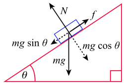 Nishabli tekislikdagi blok uchun erkin tana diagrammasi, tekislikka perpendikulyar boʻlgan normal kuchni (N), pastga qarab tortishish kuchini (mg) va qoʻllanishi mumkin boʻlgan tekislik yoʻnalishi boʻylab f kuchini tasvirlaydi., qator orqali.