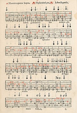 Raqamli viuela tabulaturasi. Miguel de Fuenllananing „Orphenica Lyra“ (1554) kitobidan. Qizil raqamlar bilan qoʻshiqchi ijro etadigan qism berilgan.