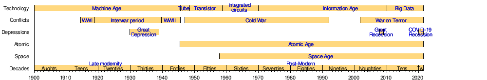 ПостмодернПоздняя современностьКосмическая эраАтомная эраCOVID-19COVID-19Великая рецессияВеликая рецессияВеликая депрессияВеликая депрессияВойна с терроризмомХолодная войнаВторая мировая войнаМежвоенный периодПервая мировая войнаBig DataИнформационная эраИнтегральная схемаИнтегральная схемаТранзисторЭлектронная лампаМашинная эра